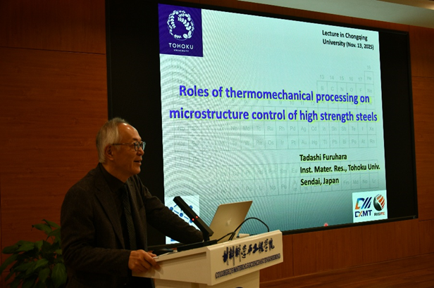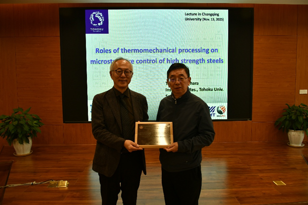 2025年11月13日,日本钢铁协会会长、金属学会副会长、Acta Materialia和 Scripta Materialia编委、日本东北大学金属研究所所长Tadashi Furuhara教授应邀访问重庆大学材料学院,并为全院师生作工程科学前沿讲坛主题报告。本次讲座由材料学院侯自勇副教授主持,全院百余师生在B区材料楼学术报告厅共享学术盛宴。